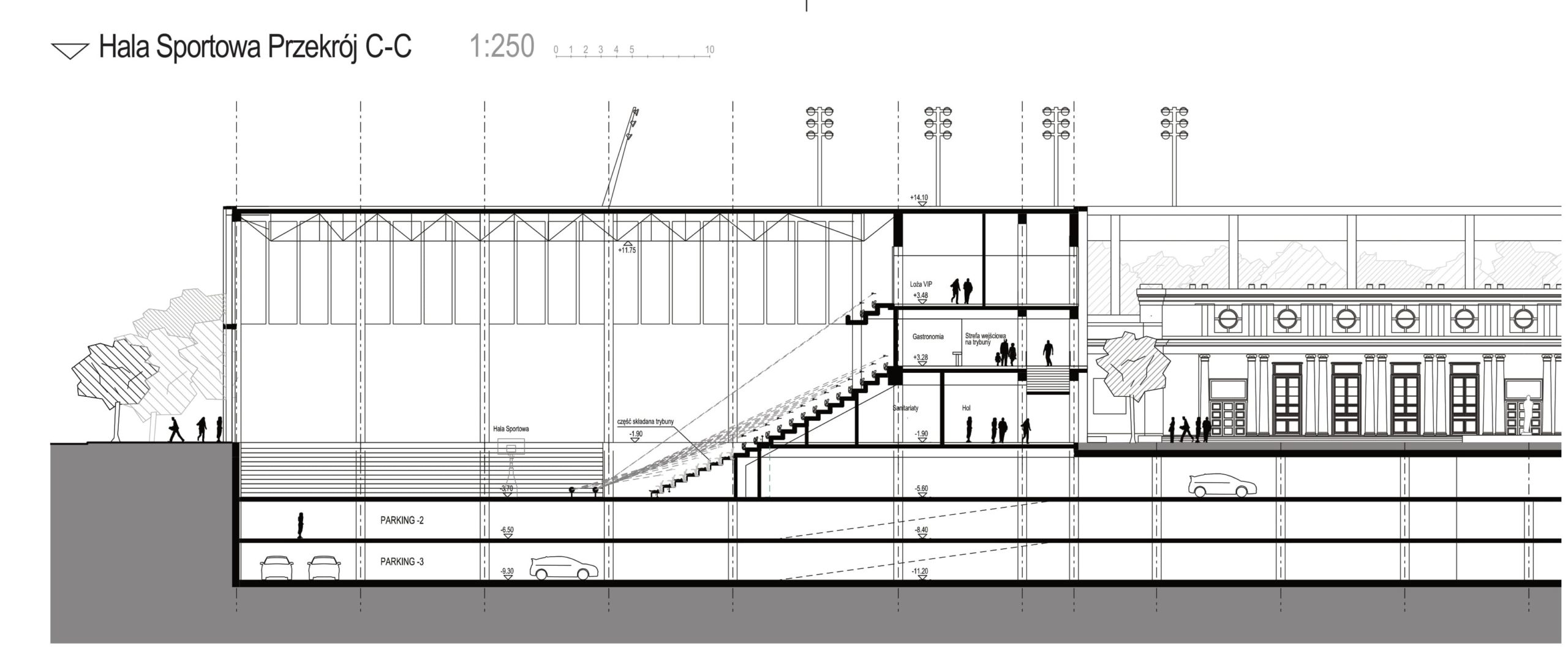 Drugi istotny element, to zwiększenie liczby kondygnacji hali – z 3 do 4. Na pierwotnie przewidzianym na parking poziomie -1, znaleźć się ma parkiet, przestrzeń magazynowa, szatnie, zaplecze medyczne i przestrzeń dla sędziów, pierwotnie ulokowanych na poziomie 0. Na przekroju obrazującego poszczególne poziomy nie widać przestrzeni na pomieszczenia techniczne, które miały znajdować się na poziomach -1, -2 i -3. Dwie „strefy techniczne” widać na poziomie -1. Podobnie jak wg pierwotnych planów, szczyt hali będzie 14,1 m nad ziemią.
